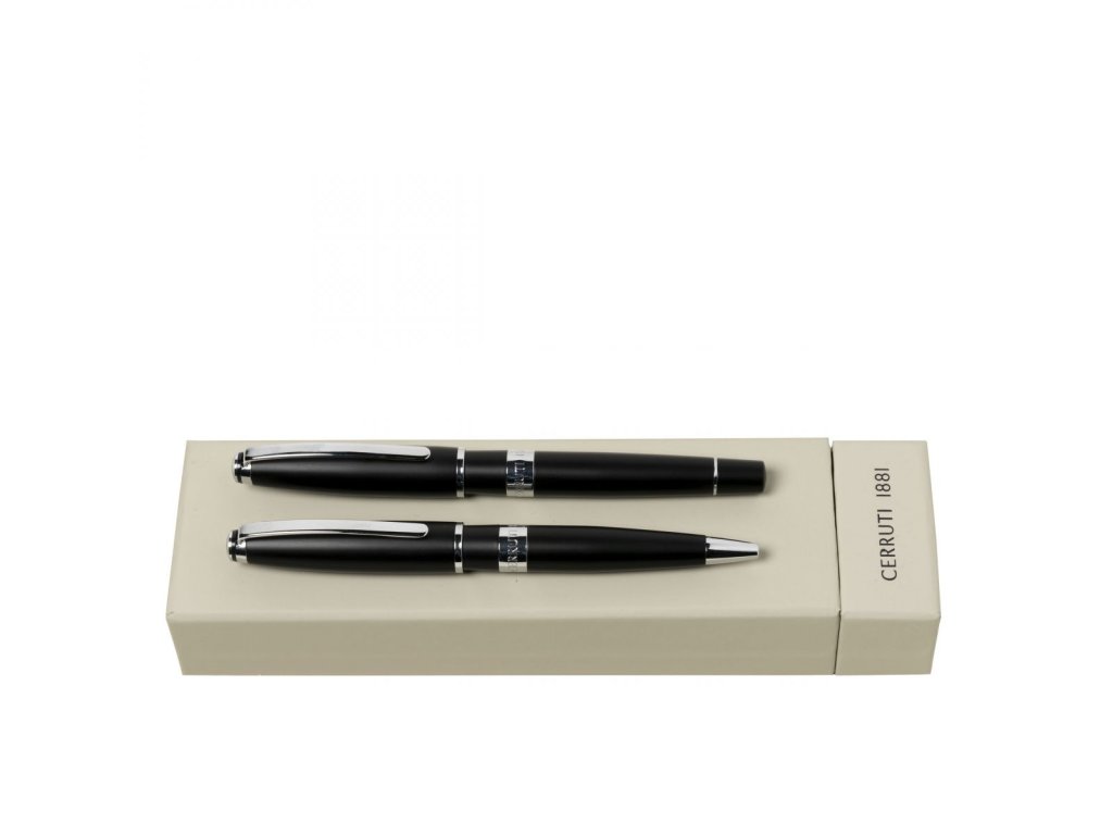 Značková psací souprava CERRUTI 1881 Bicolore obsahuje kuličkové pero a roller. Kombinuje matně černé tělo a víčko chromovanou špičkou, klipem a prstencem. Materiál: mosaz, chrom, lak Cena se zobrazí po přihlášeníDoplňkové parametry