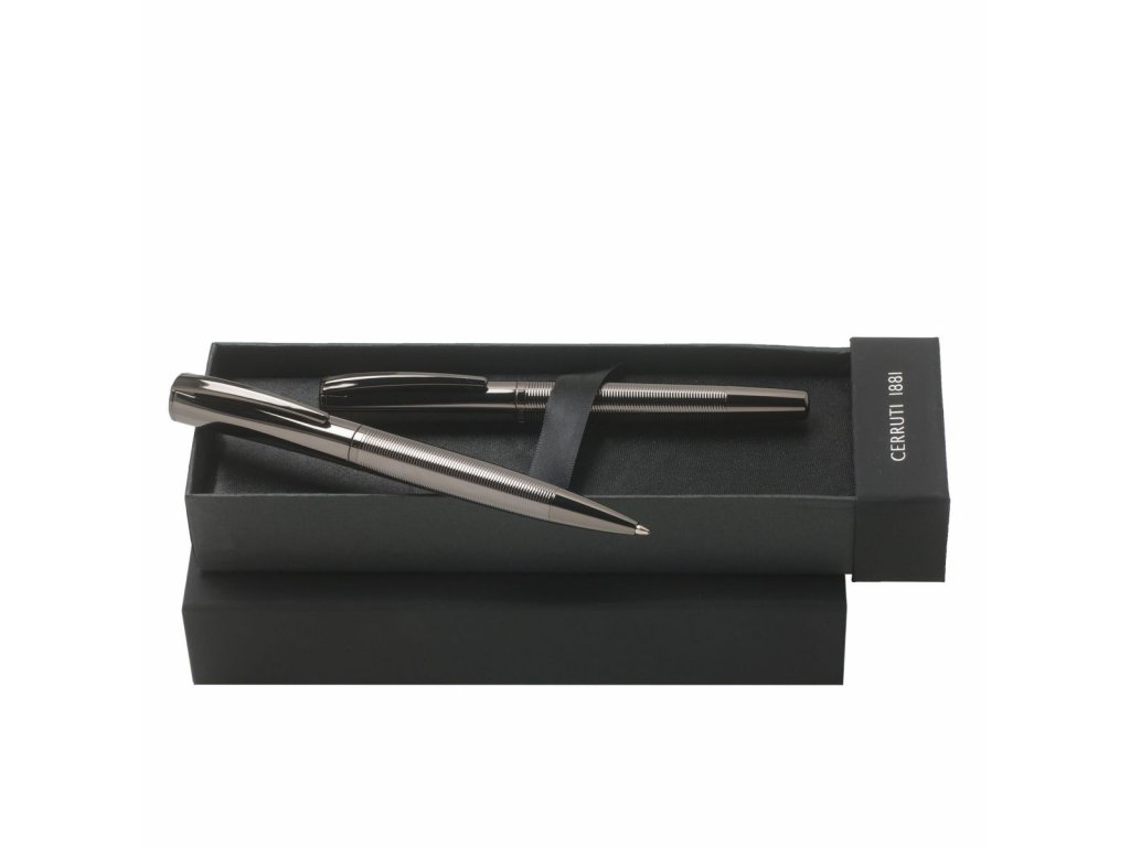 Značková psací souprava CERRUTI 1881 Conquest Gun obsahuje kuličkové pero a roller. Celé jemně vroubkované tělo i s hladkým víčkem a doplňky jsou potaženy gun povlakem. Materiál: mosaz, gun chrom Cena se zobrazí po přihlášeníDoplňkové parametry