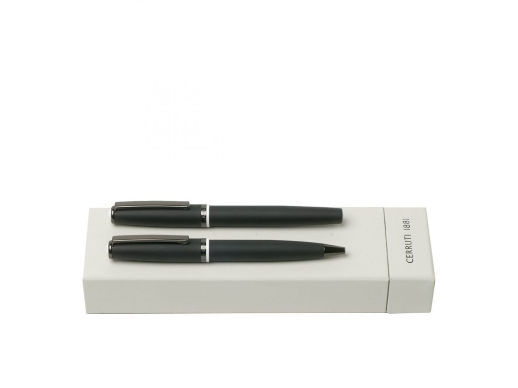Značková psací souprava CERRUTI 1881 Spring obsahuje roller a plnící pero. Mají černé, matně lakované tělo, temně chromovanou špičku a klip. Víčko má bílá zakončení Materiál: mosaz, chrom, lak Cena se zobrazí po přihlášeníDoplňkové parametry
