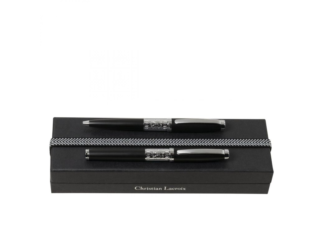 Značková psací souprava CHRISTIAN LACROIX More obsahuje kuličkové pero a roller. Pera jsou lakována matným černým lakem. Svůj elegantní vzhled staví na kontrastu mezi uvedenou barvou a leštěným chromováním doplňků a středového prstence. Na něm je vyryto logo výrobce obklopené chevronovým vzorem. Materiál: mosaz, chrom, lak Cena se zobrazí po přihlášeníDoplňkové parametry