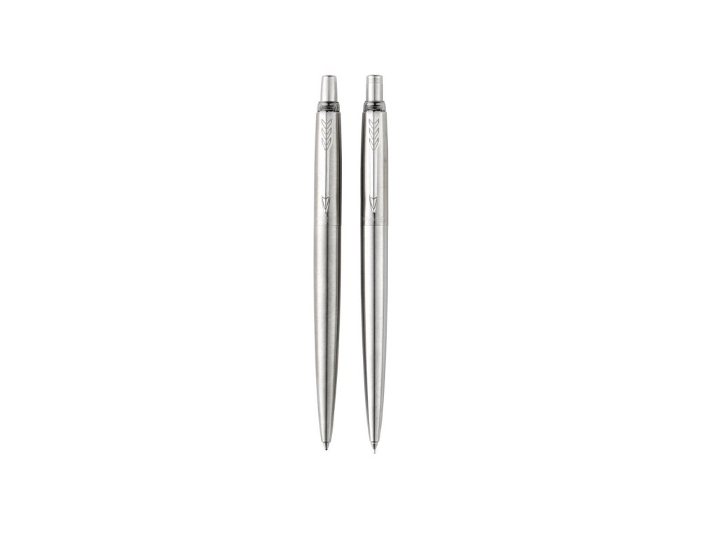 Značková psací souprava PARKER Jotter Stainless Steel CT obsahuje kuličkové pero a mechanickou tužku. Modře píšící kuličové pero má tělo z broušené nerezové oceli. V kombinaci s klipem pokoveným chromem s leštěnou úpravou a stiskací mechanismus. Mikrotužka má HB tuhu a průměru 0,5 mm. Parker Jotter je designérskou klasikou a důvěrně známou modelovou řadou.Doplňkové parametry