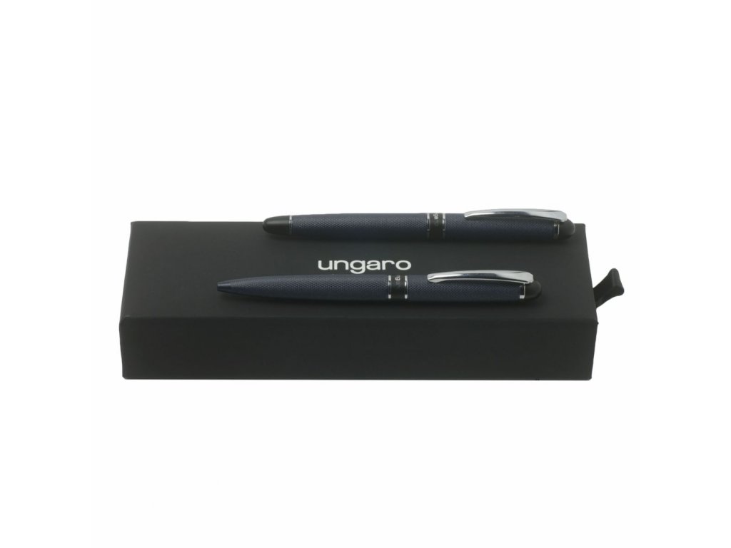 Značková psací souprava Ungaro Uomo Blue obsahuje kuličkové pero a roller. Má modré tělo pokryto vroubkováním, kterému kontrastuje chromovaný klip a kroužky. Materiál: mosaz, chrom, lak Cena se zobrazí po přihlášeníDoplňkové parametry