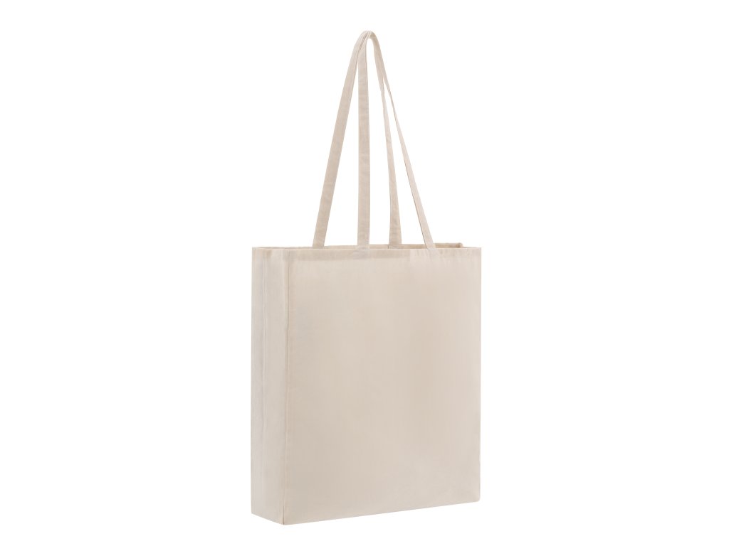 Taška vyrobená z bavlny, přírodní povrchová úprava, 140 g/m2. Prošitá úprava, s klínem na dně a dlouhými vyztuženými uchy (70 x 2,5 cm). Odolnost do 6 kg hmotnosti.