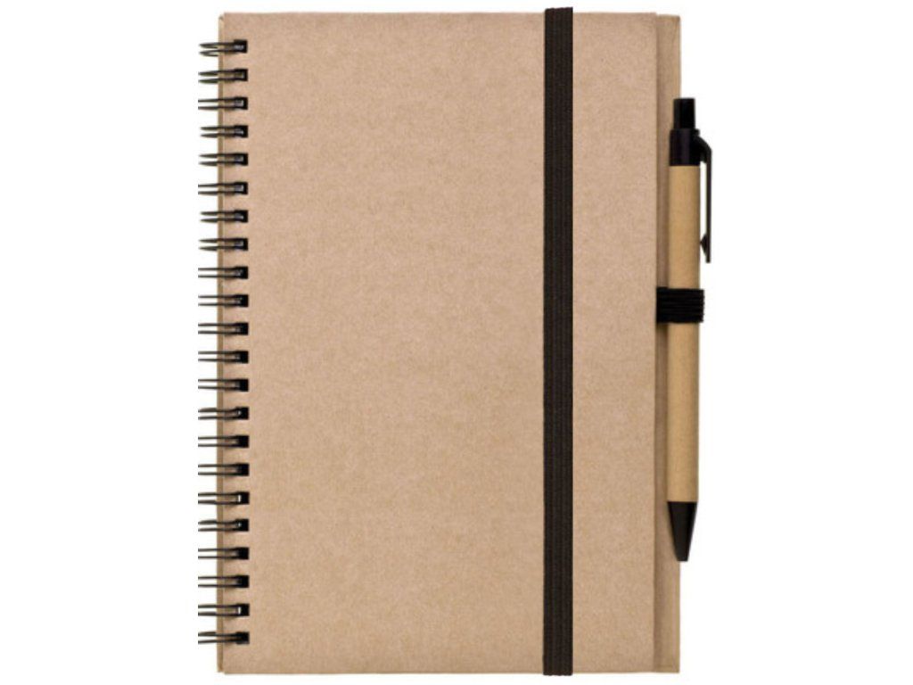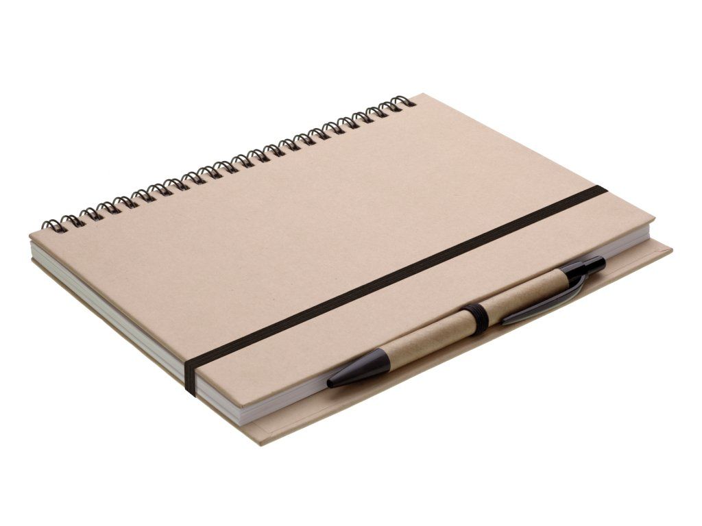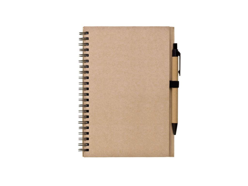 Blok A5 s kroužkovou vazbou v pevných kartonových deskách. 60 listů bílého papíru, baleno v sáčku. Součástí bloku je papírová propiska s černým doplňkem připevněná na přinýtovaném poutku.Doplňkové parametry