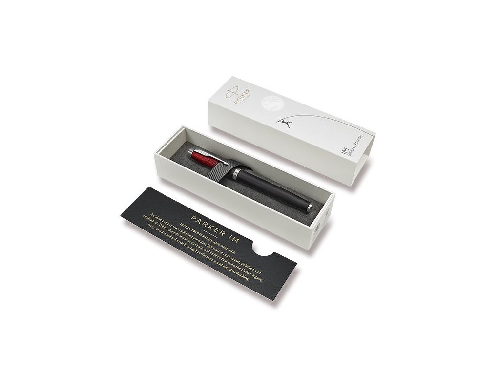 Značkový roller PARKER IM SE Red Ignite má matně černě lakované mosazné tělo i nasazovací víčko. Víčko má laserem vytvořené zdobení a přechází do červené barvy. V kombinaci s mosaznými doplňky pokovenými chromem. Parker IM je ideální partner s neomezenými možnostmi. Novinka 05-2019 / Limitovaná ediceDoplňkové parametry