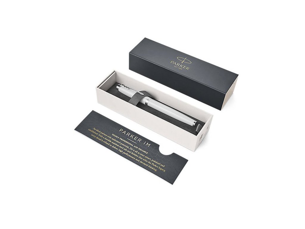 Značkový roller PARKER IM White CT má mosazné tělo i nasazovací víčko leskle bíle lakováno. V kombinaci s doplňky pokovenými chromem s leštěnou úpravou. Parker IM je ideální partner s neomezenými možnostmi.Doplňkové parametry