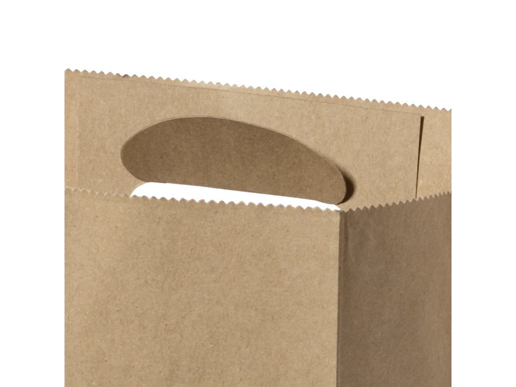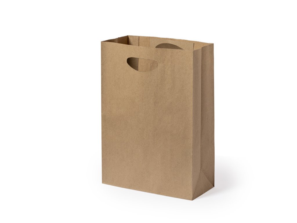 Lehká taška z recyklovaného papíru o hmotnosti 80 g/m2. S originální vysekávanou rukojetí a klínem.