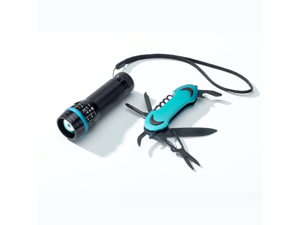 Colorado I je praktická sada obsahující LED svítilnu a kapesní nůž. Svítilna je vyrobena z hliníku a vyzařuje soustředěné světlo. Kapesní nůž obsahuje skládací sadu čepelí a vestavěnou vývrtku, otvírák na láhve, křížový šroubovák, pilník na nehty a nůžky. Sada je zabalena v elegantní krabičce.Doplňkové parametry