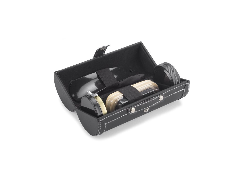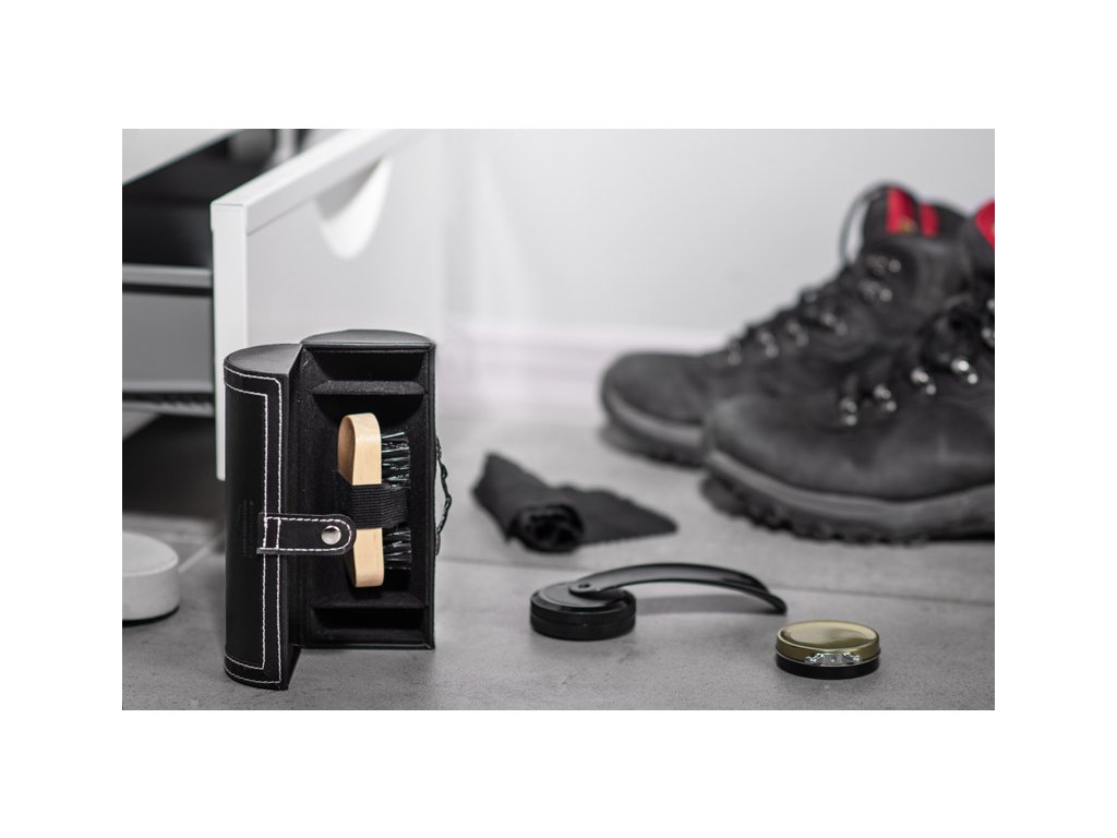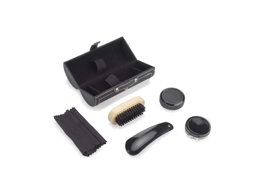 Sada na čištění obuvi SHINBO z materiálu podobného kůži (PU). Obsahuje průhledné leštidlo, čisticí prostředek, lžíci na boty, hadřík a kartáček.Doplňkové parametry
