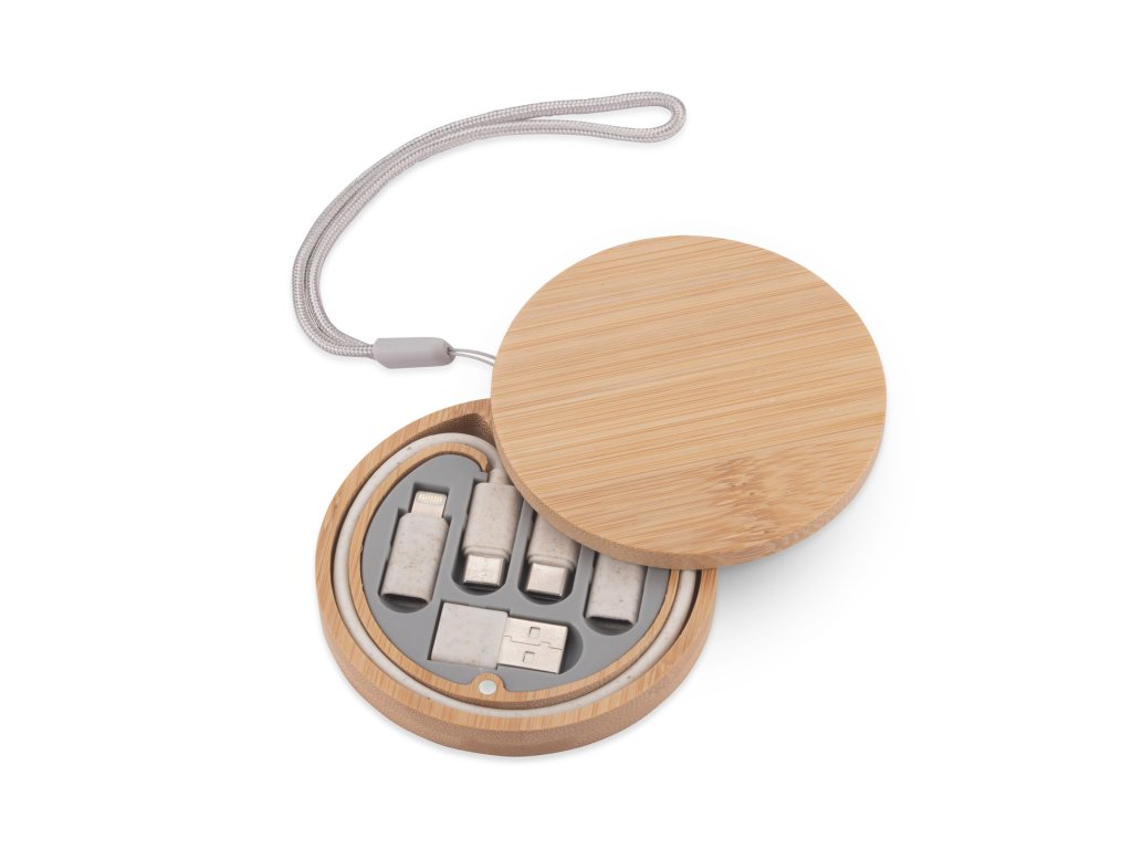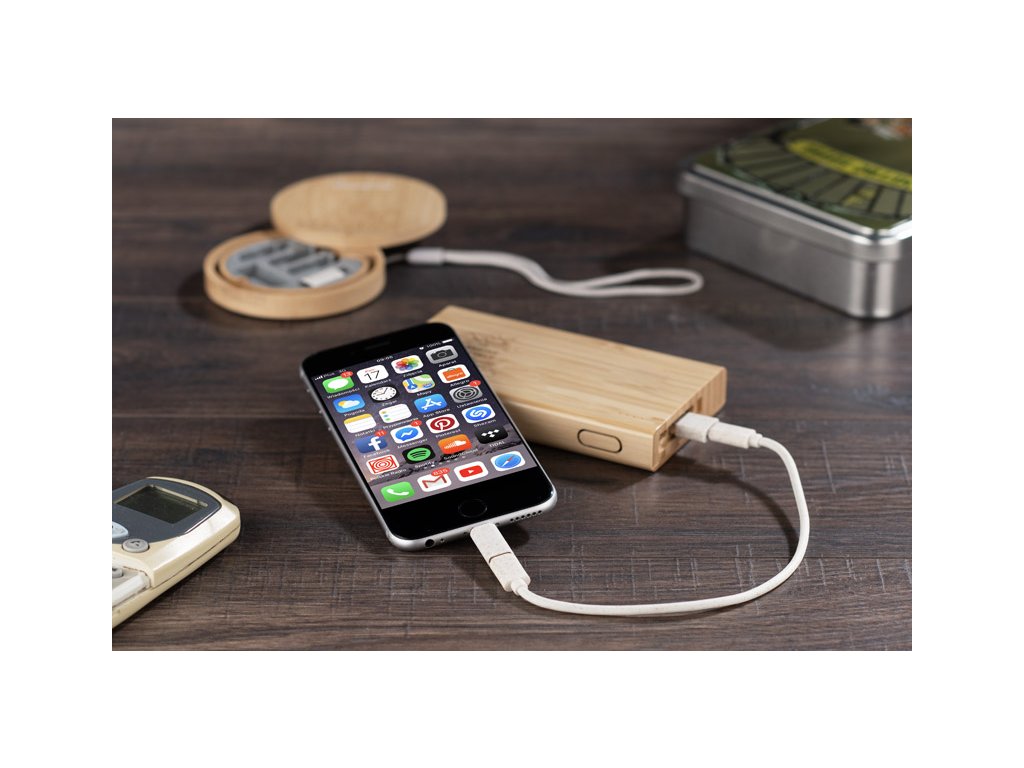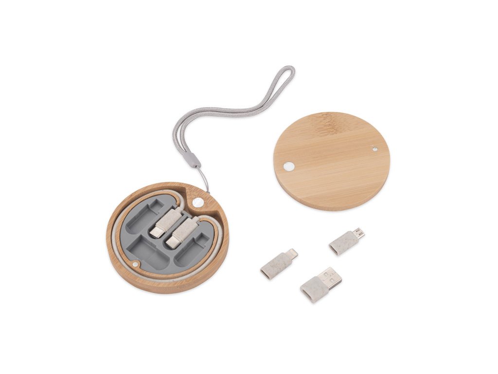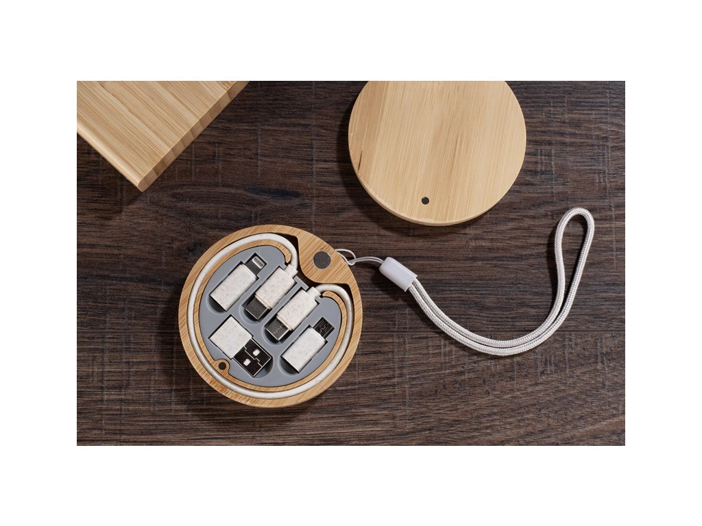 Dodává se se sadou nabíjecích kabelů ve stylovém balení z bambusu. Kabely mají funkci nabíjení i přenosu dat. Sada obsahuje 4 typy koncovek: USB typu C, USB, micro USB a adaptér kompatibilní se zařízeními iOS. Jsou vyrobeny z pšeničné slámy.Doplňkové parametry