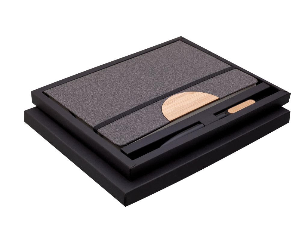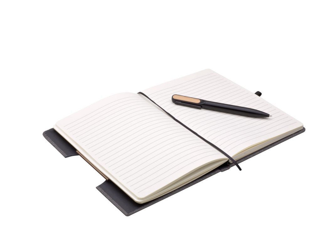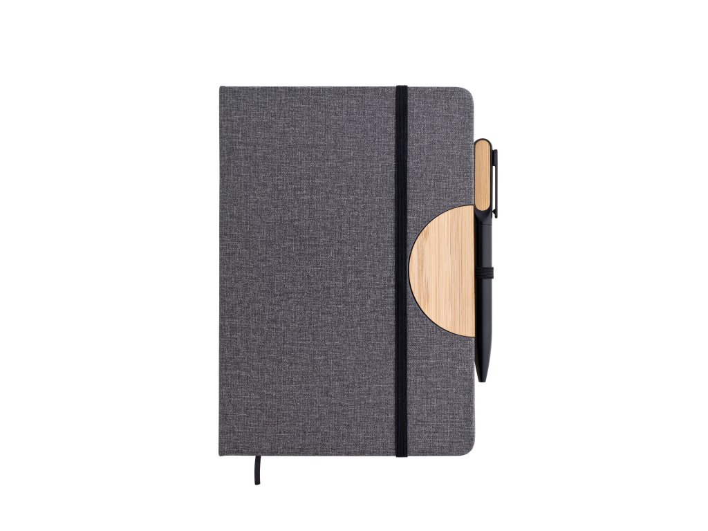 Poznámkový blok, zápisník v textilních deskách, které lze použít jako stojánek na mobil. V černé dárkové krabičce s otočnou propiskou s bambusovou vsadkou.Doplňkové parametry