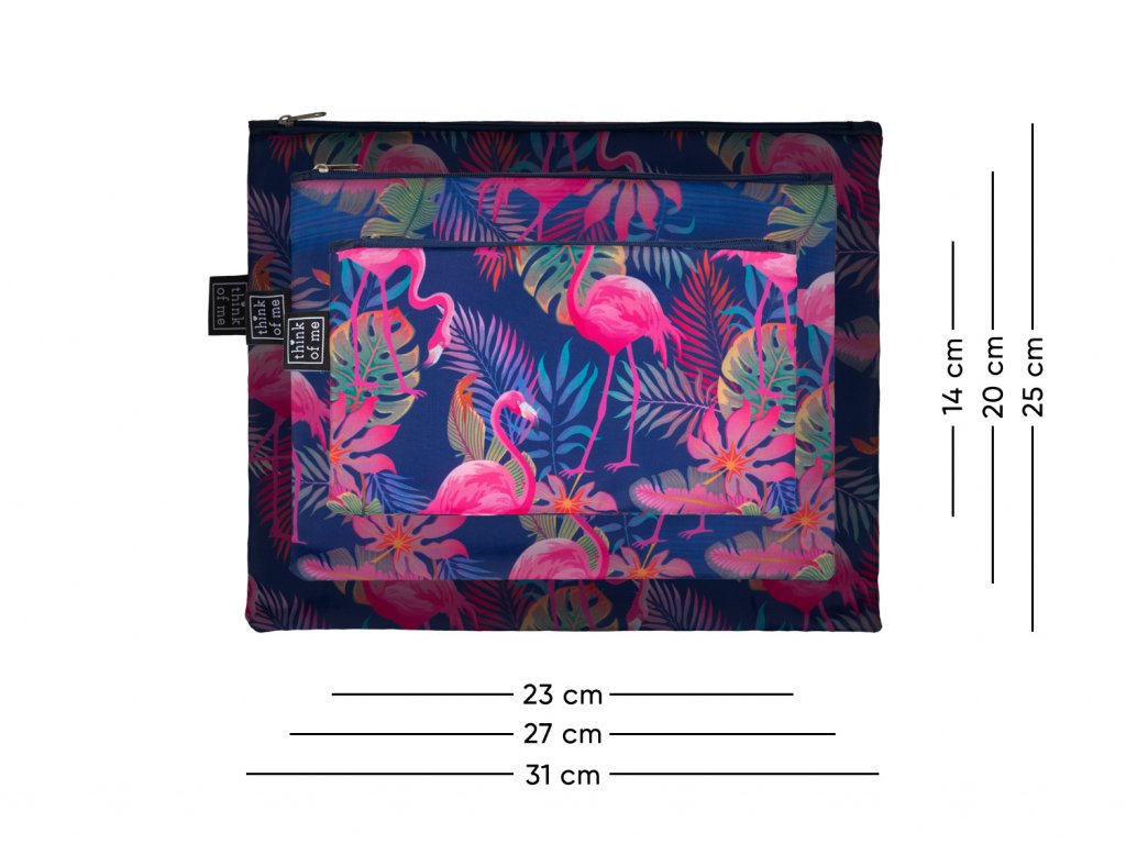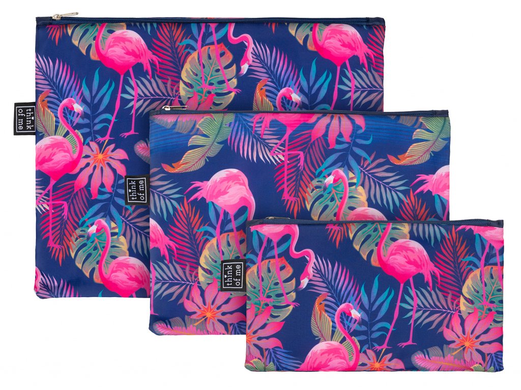 Kam uklidit kartáček, zubní pastu nebo rtěnku? Jak v kufru oddělit ponožky a spodní prádlo? Mít hned po ruce doklady a další potřebné dokumenty? Máme pro vás skvělé řešení! Díky těmto praktickým a stylovým taštičkám na zip ve třech velikostech máte vše pohodlně a rychle po ruce. Taštičky jsou potištěné motivem trendy plameňáků.Cestujte s radostí a bez stresu! Mějte své zavazadlo pod kontrolou.