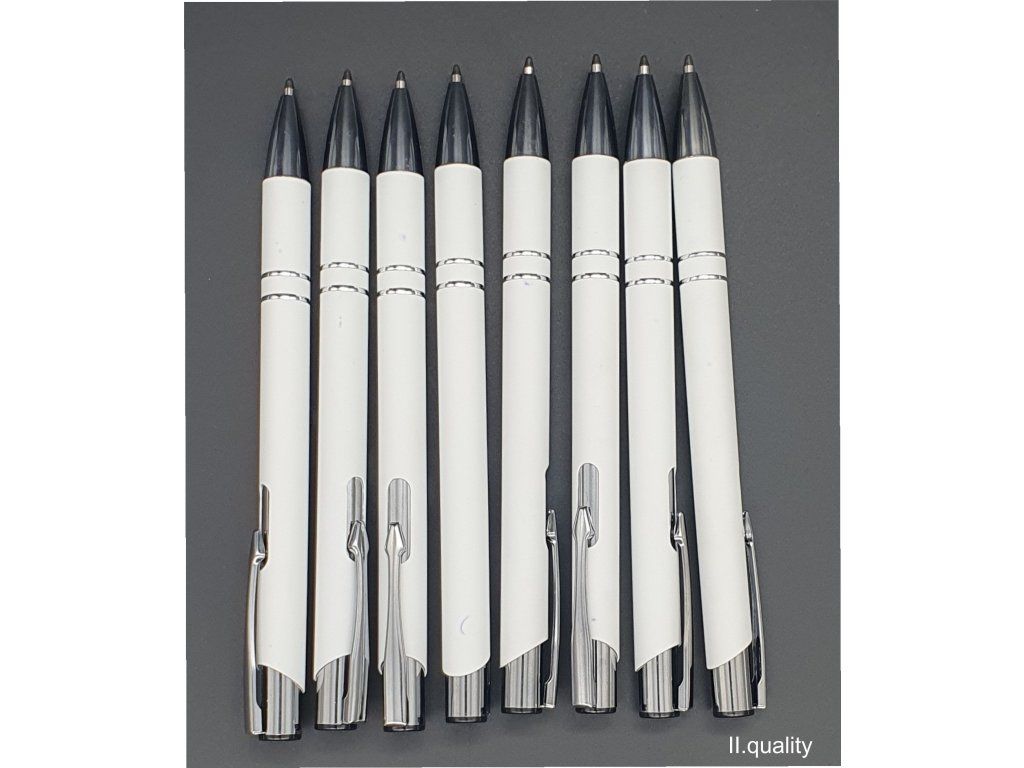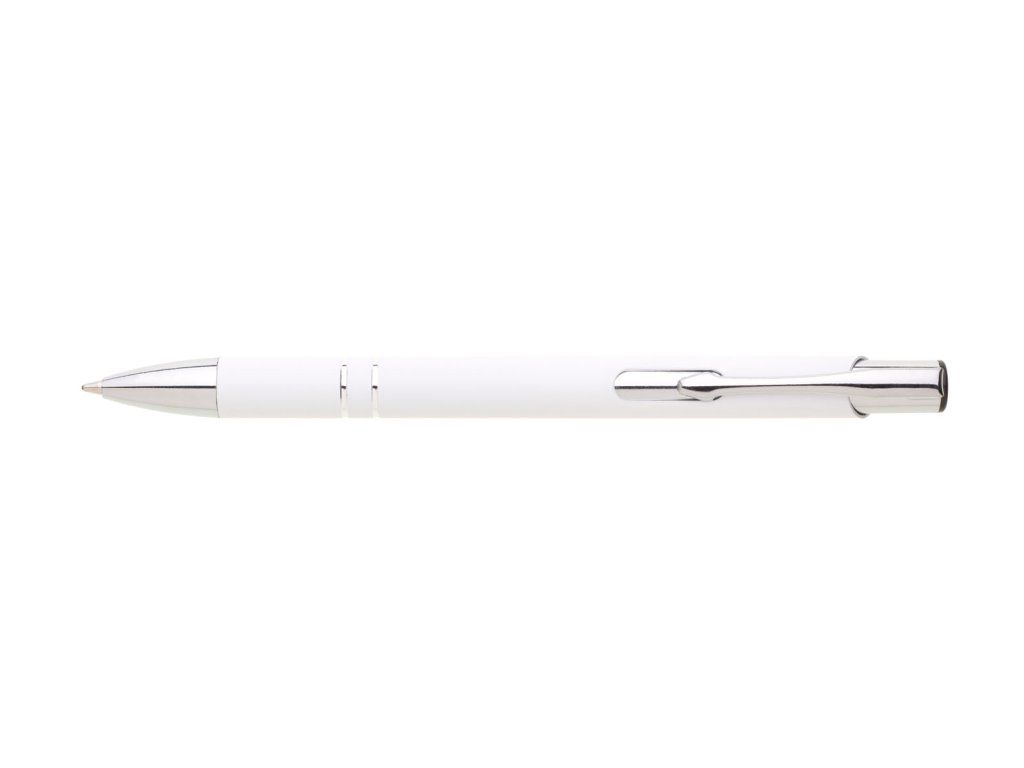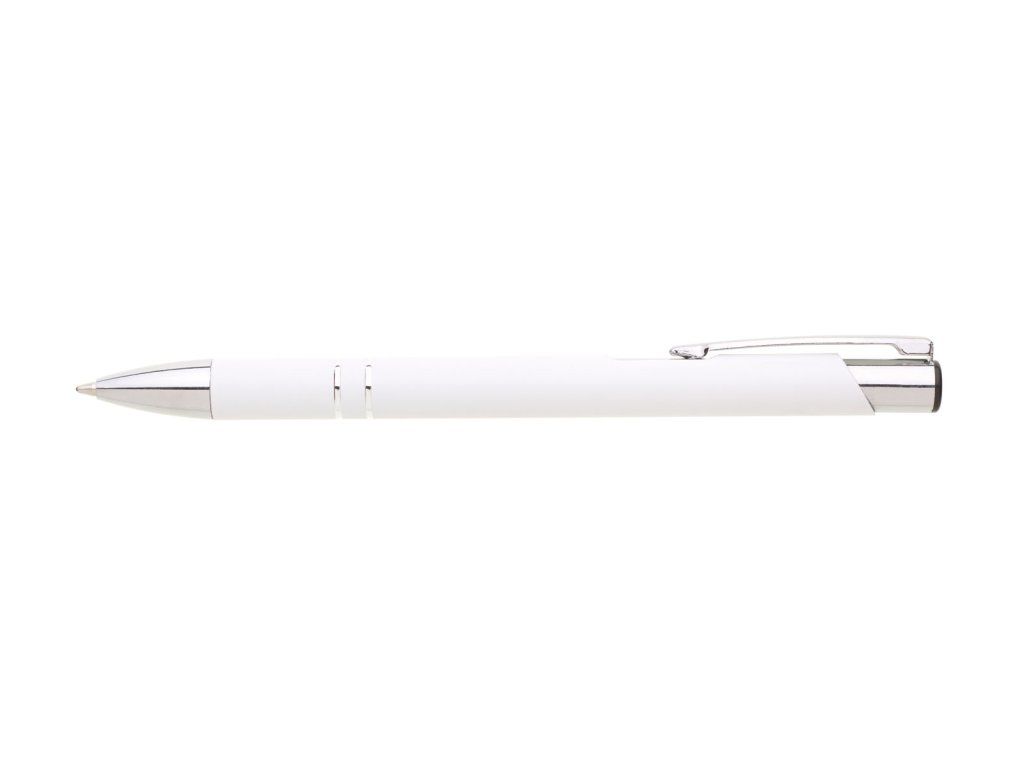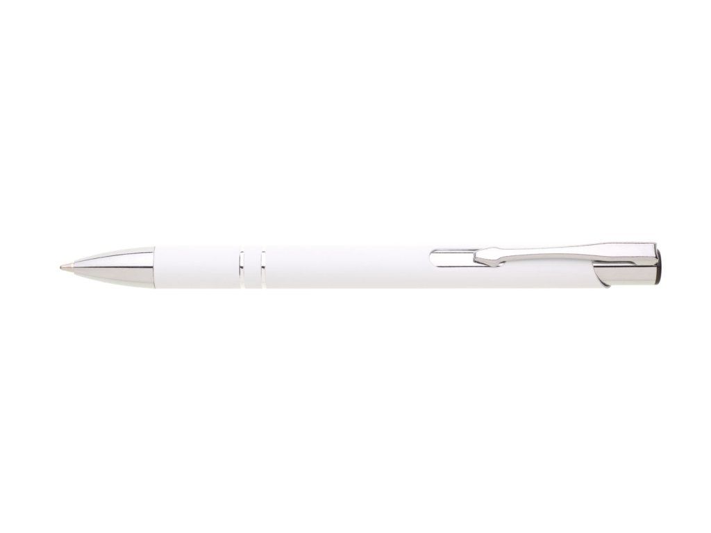 Hliníková propiska se stříbrnými doplňky a měkkým pogumovaným soft povrchem v bílé barvě. Modře píšící.Doplňkové parametry