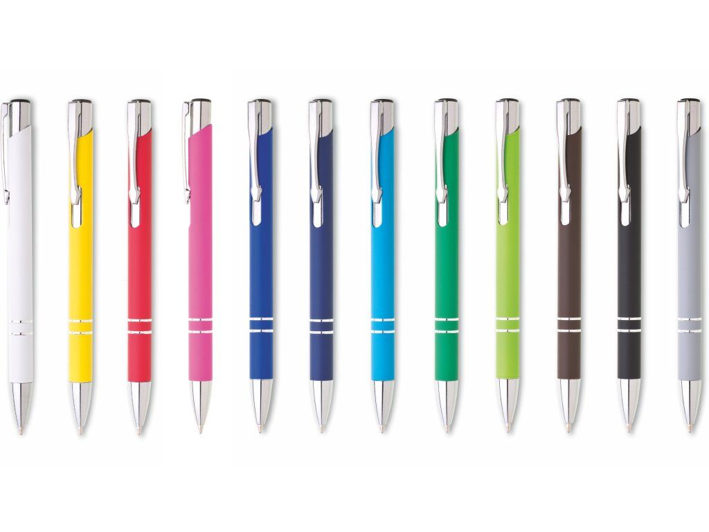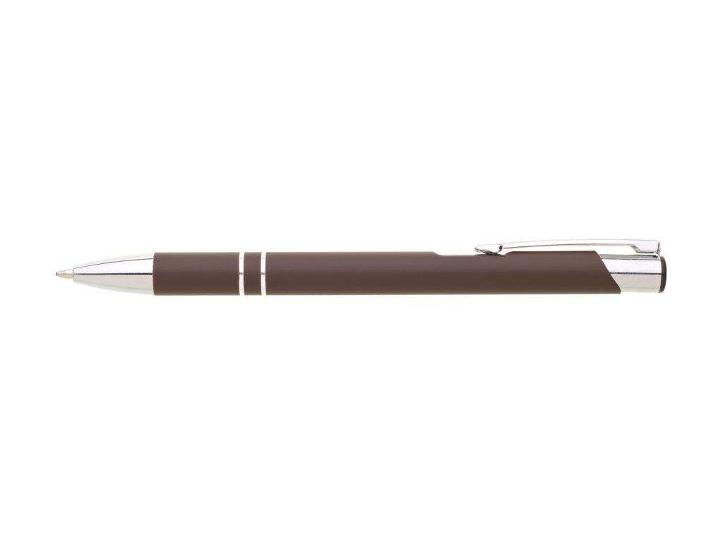 Hliníková propiska se stříbrnými doplňky a měkkým pogumovaným soft povrchem v hnědé barvě. Modře píšící.Doplňkové parametry