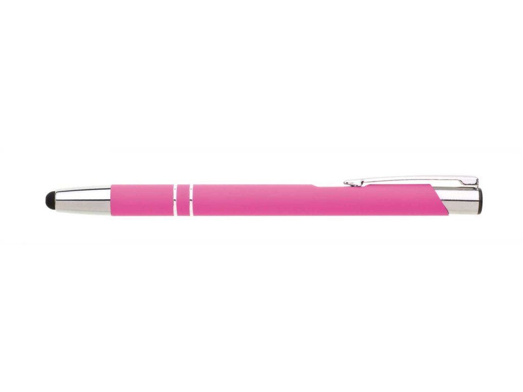 Hliníková propiska se stříbrnými doplňky a měkkým pogumovaným povrchem soft v růžové barvě s touch špičkou..Doplňkové parametry