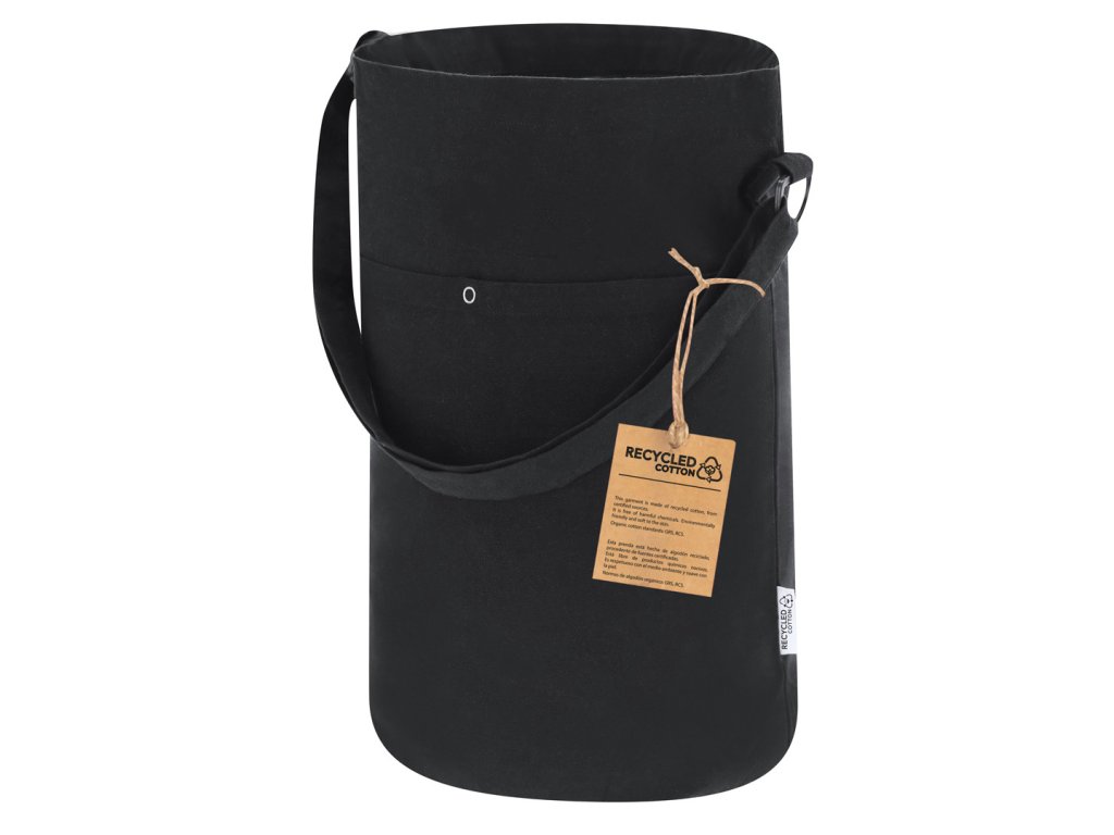 Taška z recyklované bavlny o hmotnosti 270 g/m2. Originální válcovitý tvar s velkou kapacitou, s hlavní přihrádkou, pomocnou vnitřní kapsou a praktickou vnější kapsou se zapínáním na kovovou sponu. Elegantní černá barva, prošívaná povrchová úprava a nastavitelné vyztužené dlouhé ucho. Logo Recycled Cotton na vnějším štítku.Buďte první, kdo napíše příspěvek k této položce.