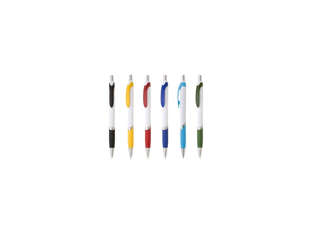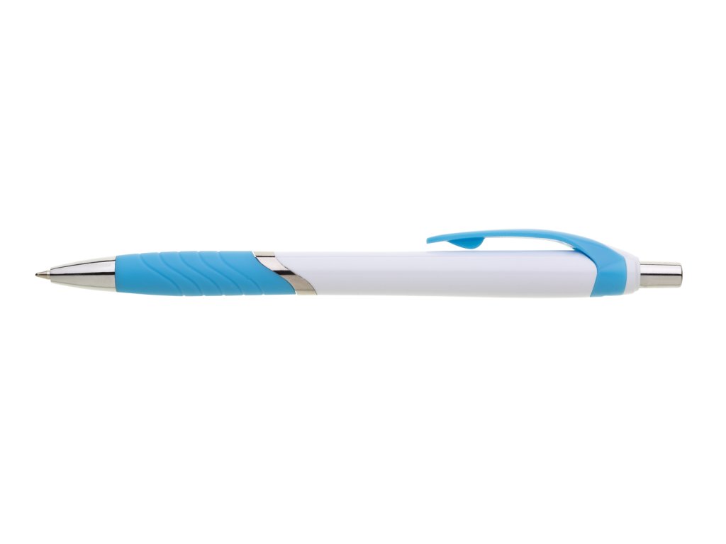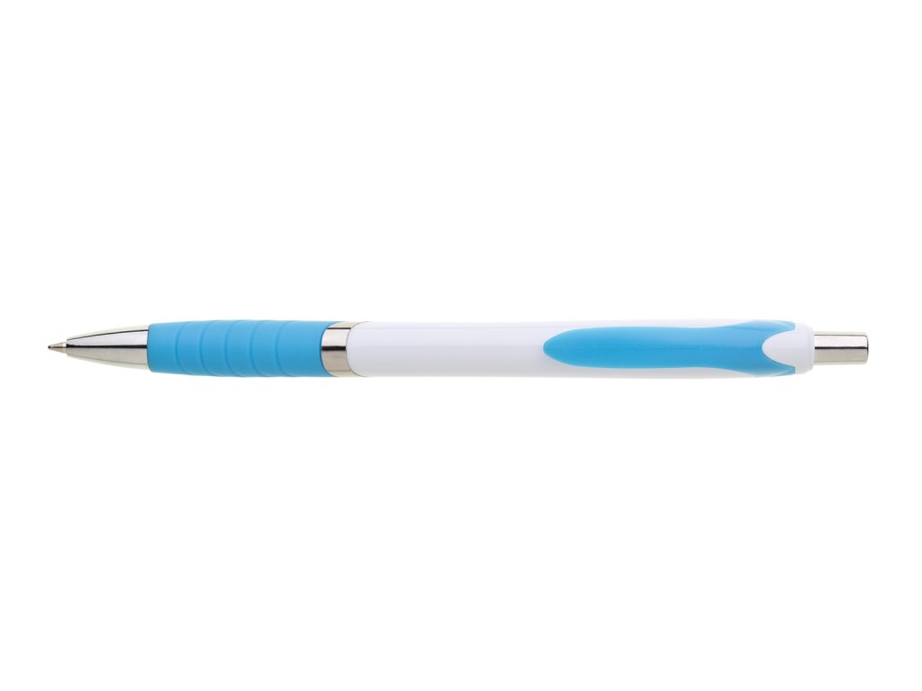 Plastová propiska s bílým tělem tyrkysovým úchopem a klipem a stříbrnými doplňky.Doplňkové parametry
