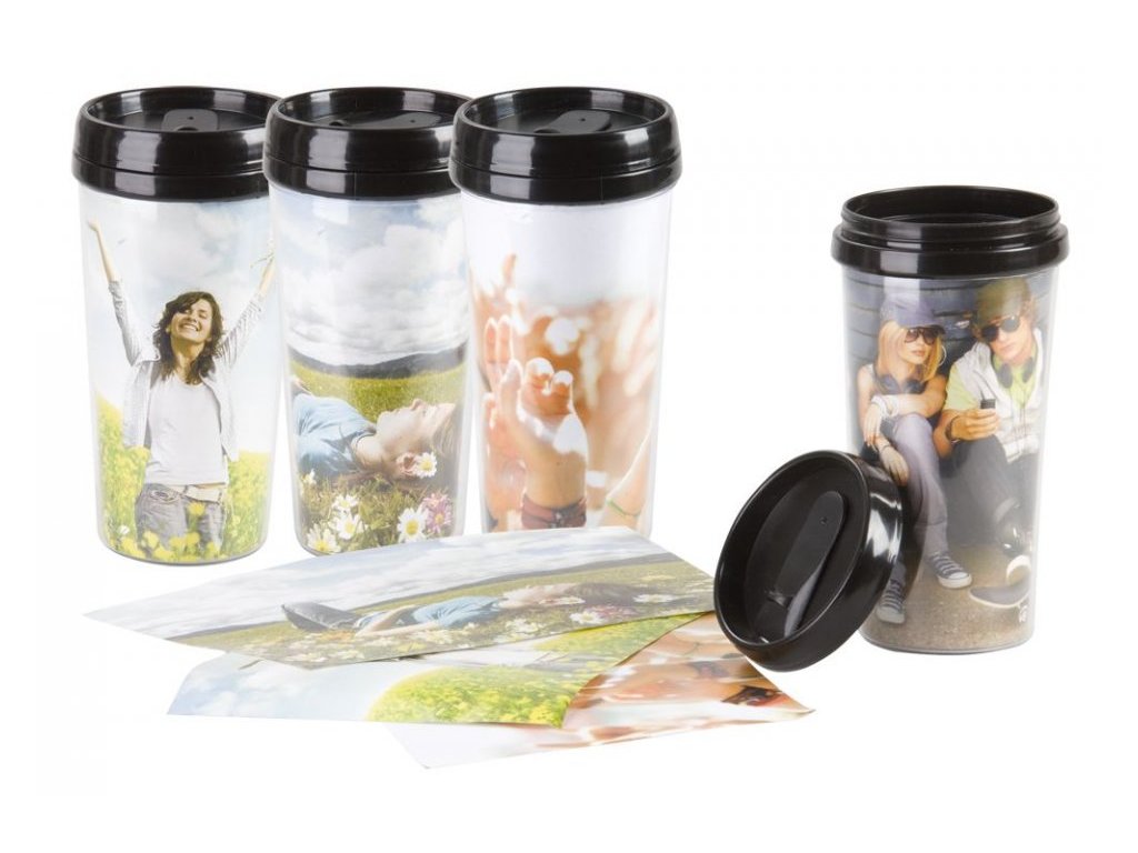 Plastový dvouvrstvý termohrnek s otvorem na pití ve víčku. Logo lze umístit mezi stěny hrnku. Objem 0,45 l