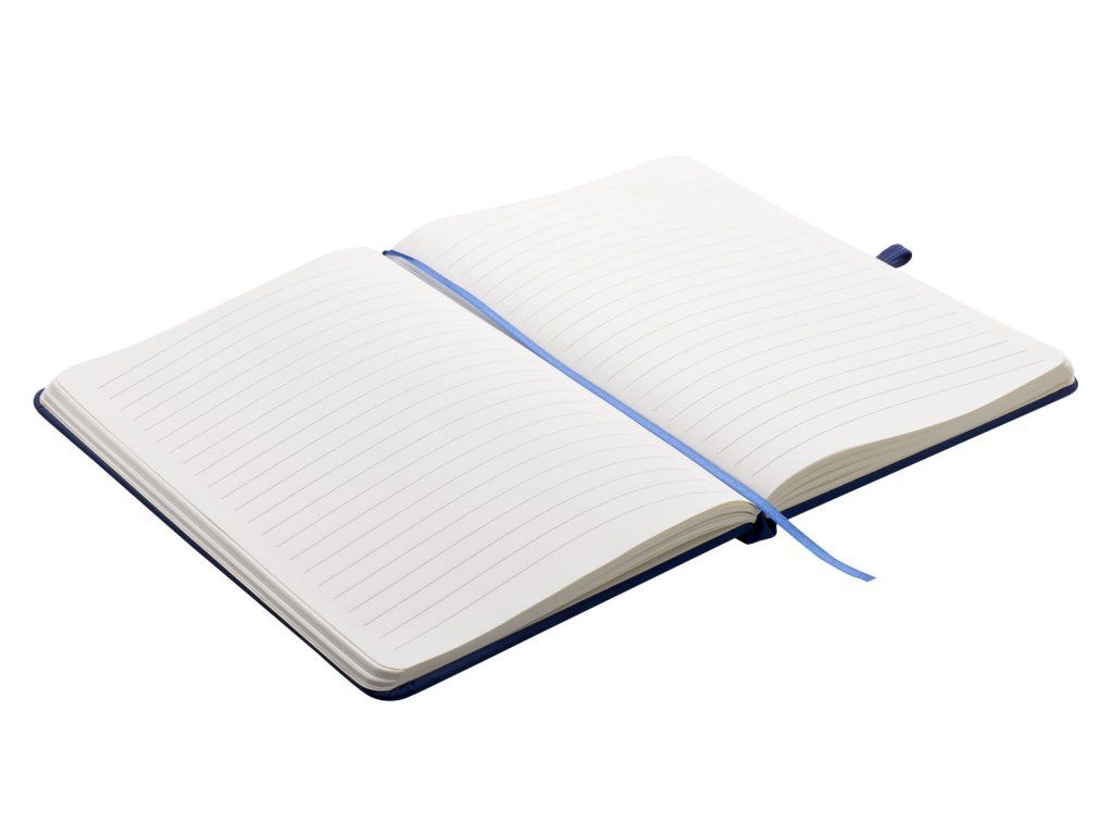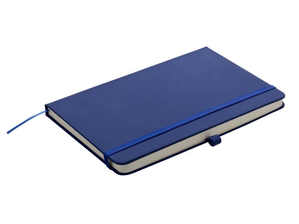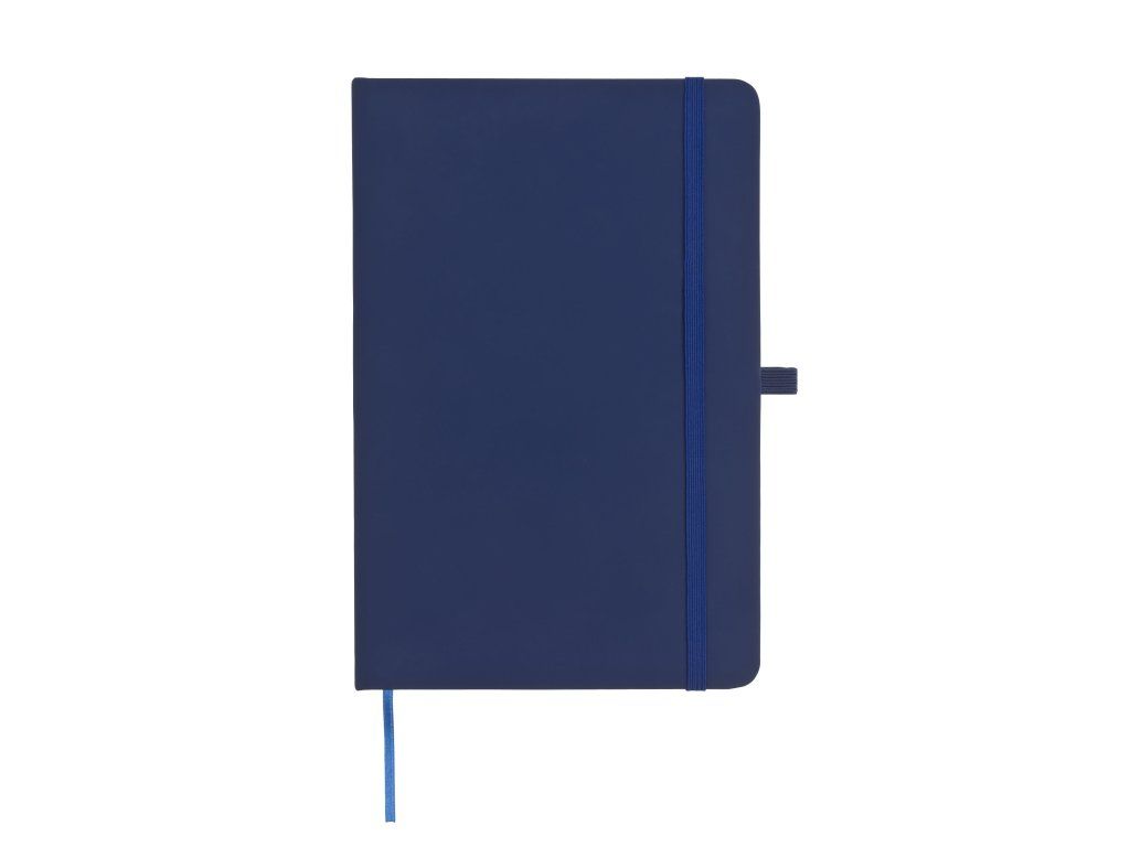 Zápisník A5 v modrých deskách z PU materiálu má 80 linkovaných listů. Blok má uzavírací gumičku, poutko na propisku a textilní záložku v barvě desek.Doplňkové parametry