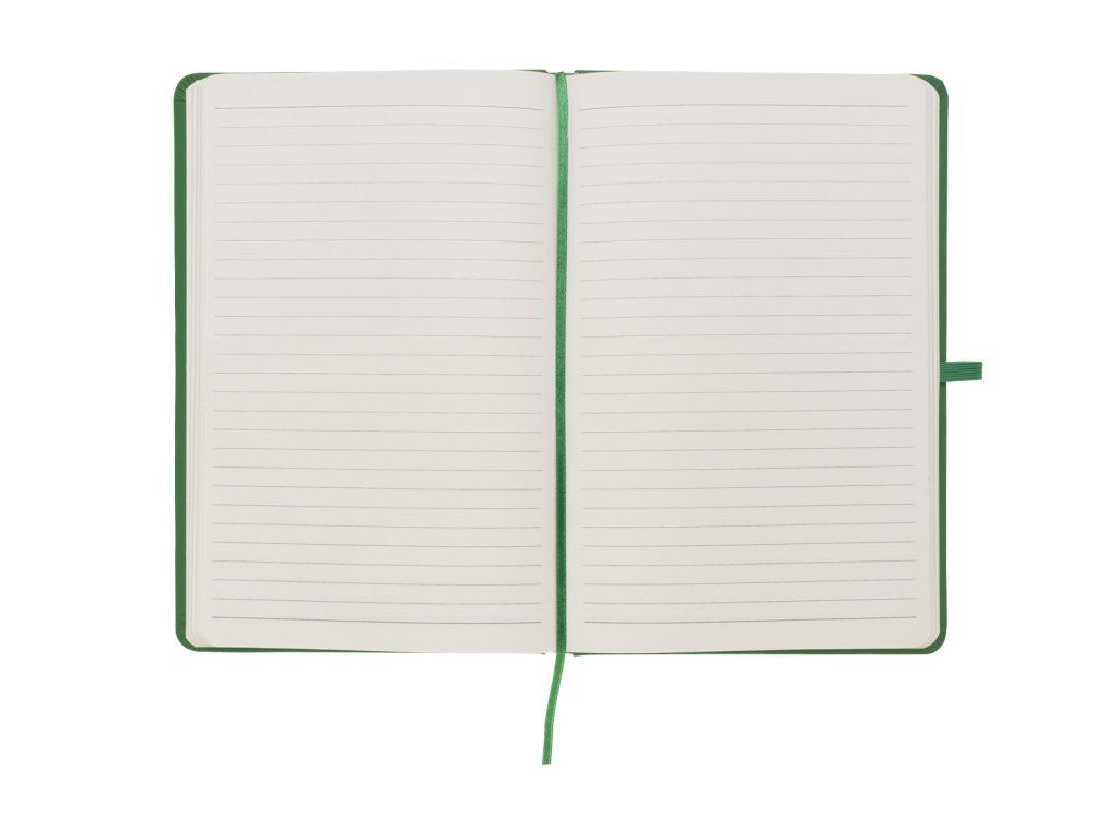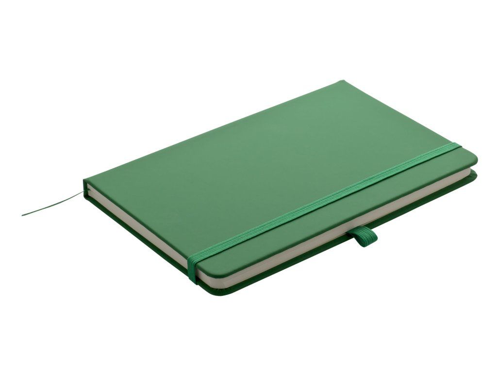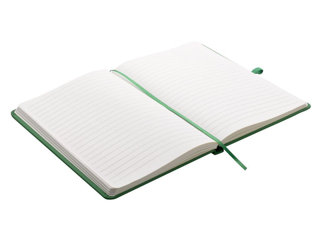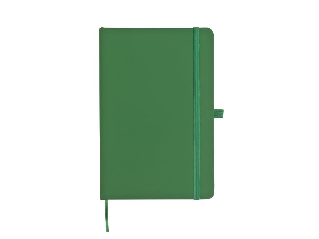 Zápisník A5 v zelených deskách z PU materiálu má 80 linkovaných listů. Blok má uzavírací gumičku, poutko na propisku a textilní záložku v barvě desek.Doplňkové parametry