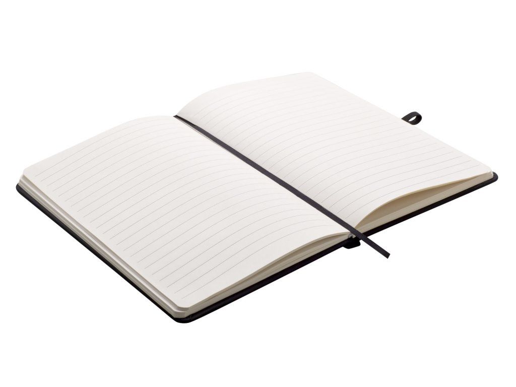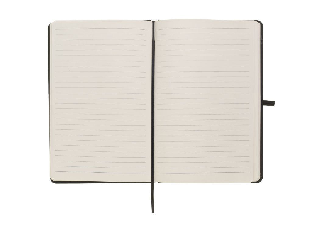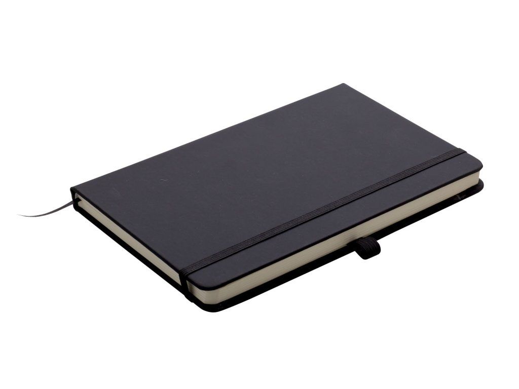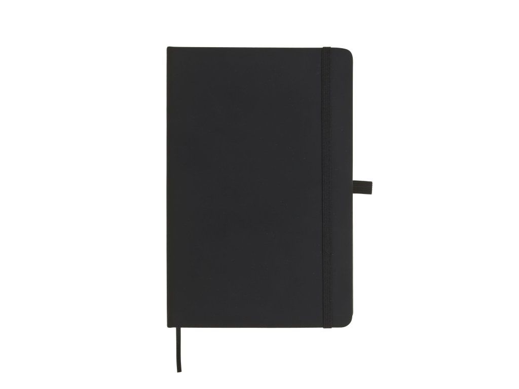 Zápisník A5 v černých deskách z PU materiálu má 80 linkovaných listů. Blok má uzavírací gumičku, poutko na propisku a textilní záložku v barvě desek.Doplňkové parametry