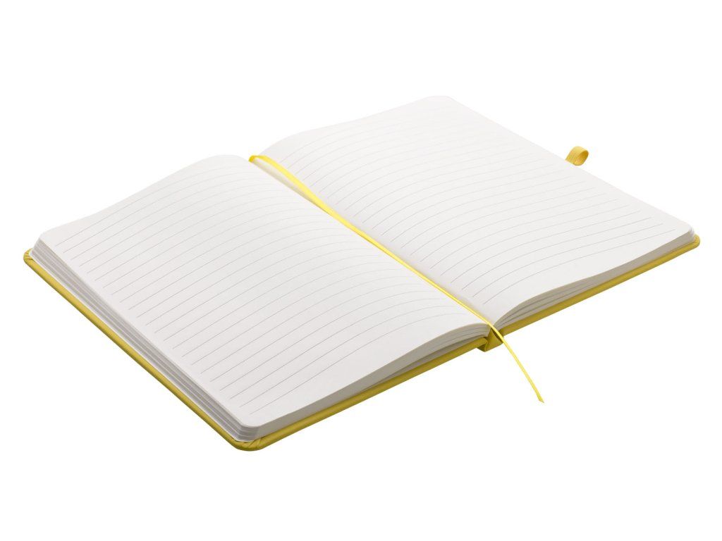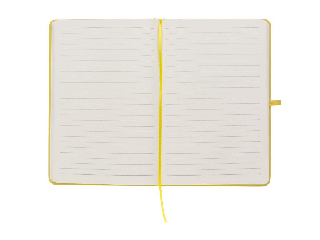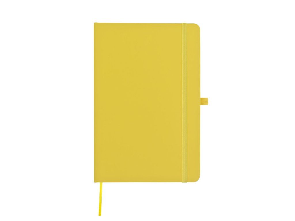 Zápisník A5 ve žlutých deskách z PU materiálu má 80 linkovaných listů. Blok má uzavírací gumičku, poutko na propisku a textilní záložku v barvě desek.Doplňkové parametry