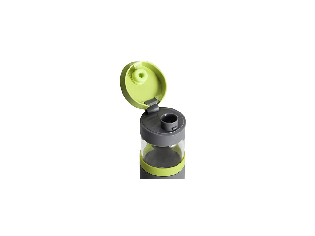 Sportovní lahev o objemu 440 ml z borosilikátového skla a plastu s popruhem na ruku, neprotékavá. Bez BPA.Doplňkové parametry