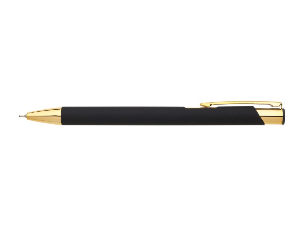 Kovová propiska s pogumovaným povrchem a zlatými doplňky, s efektem laseru v lesklé zlaté barvě. Náplň velkoobsahová, semigelová.Doplňkové parametry