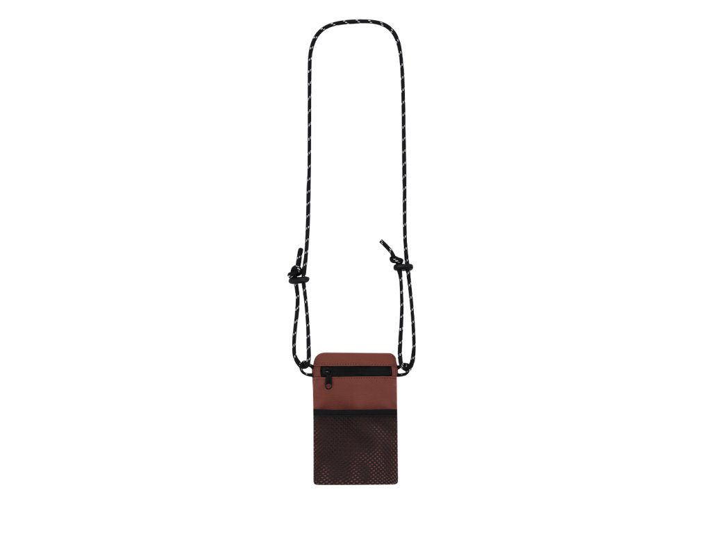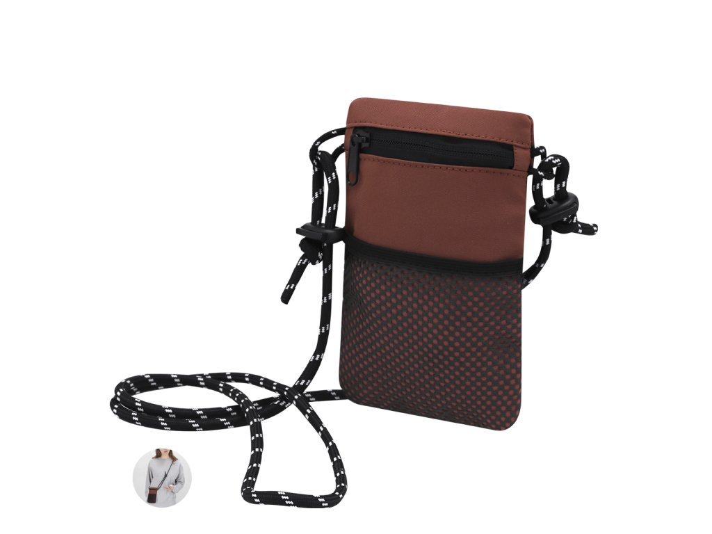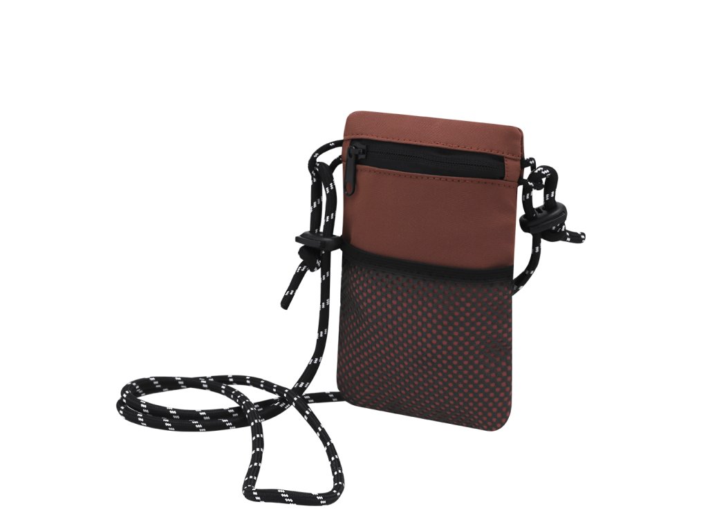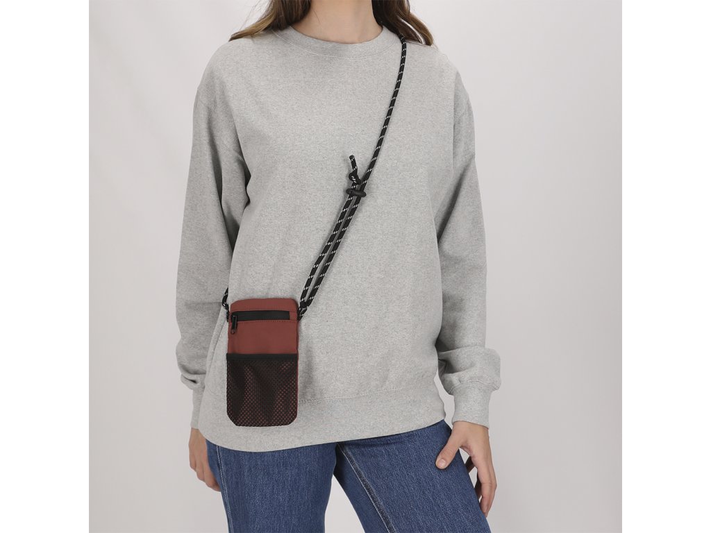 Pouzdro je vyrobeno z měkkého polyesteru 150D. Hlavní přihrádka s neviditelným zipem v černé barvě a otevřená přední síťovaná kapsa. Součástí je nastavitelný ramenní popruh z černé a bílé šňůrky.