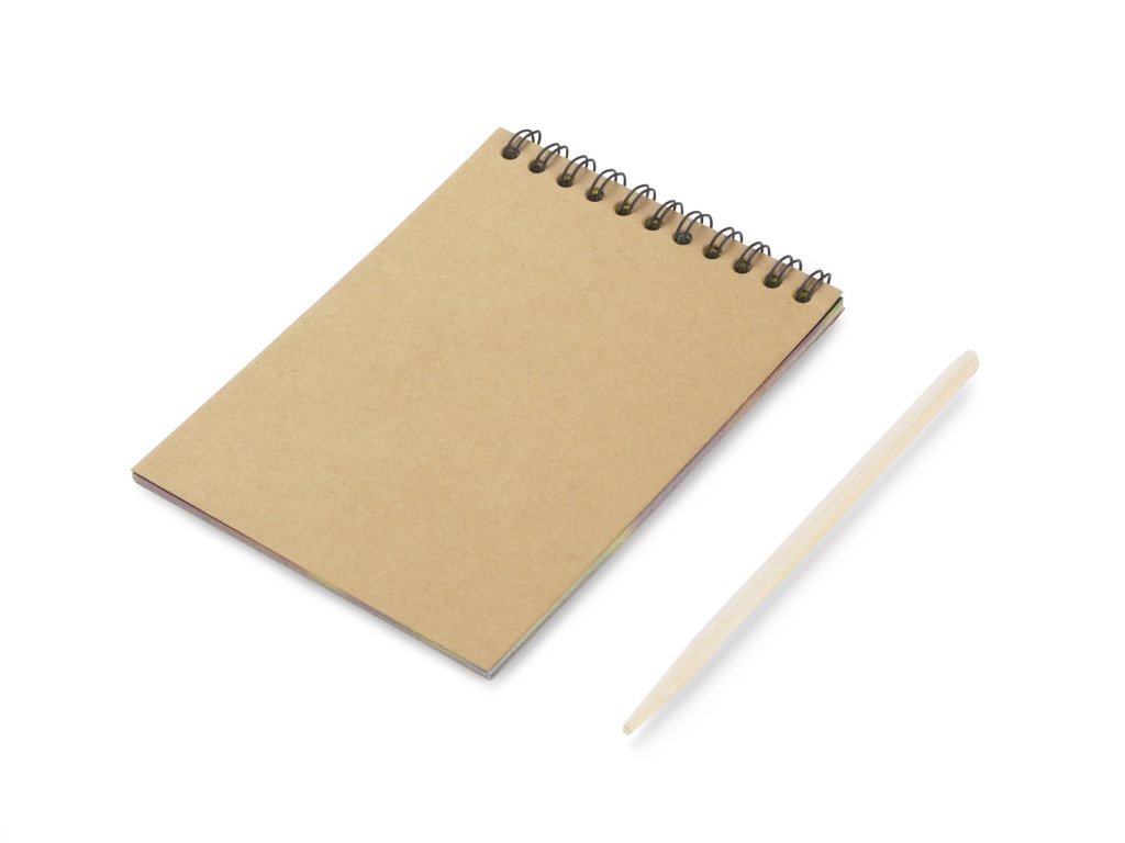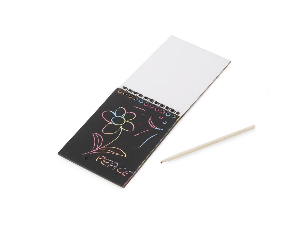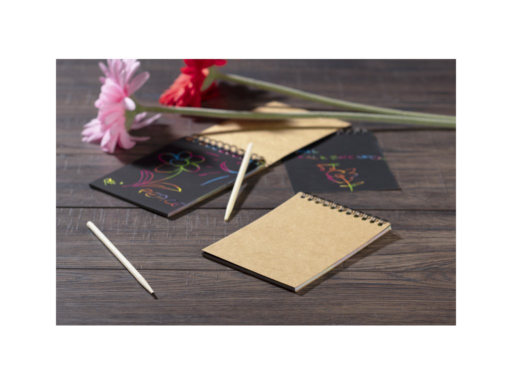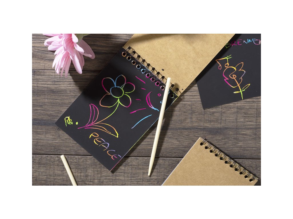Neobvyklý zápisník s černými stíracími lištami. Bambusovou hůlkou můžete vytvořit barevný duhový obraz. To vám umožní rozvíjet svou vlastní představivost vytvořením vlastních kompozic.Doplňkové parametry