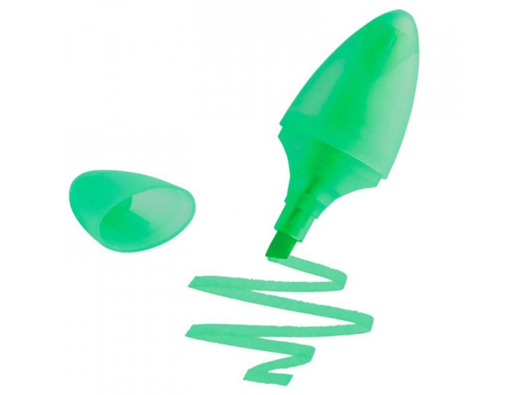 Zvýrazňovač ve tvaru kapsle v zeleném transparentním plastovém krytu.Doplňkové parametry